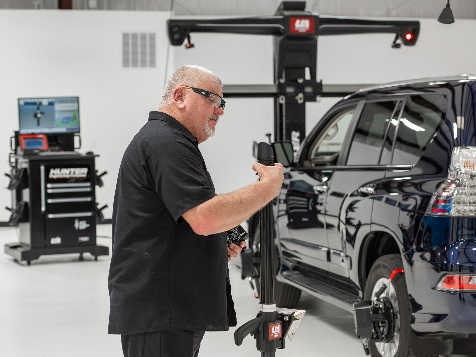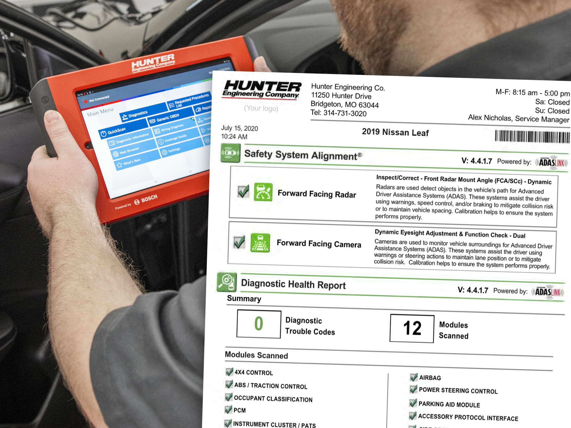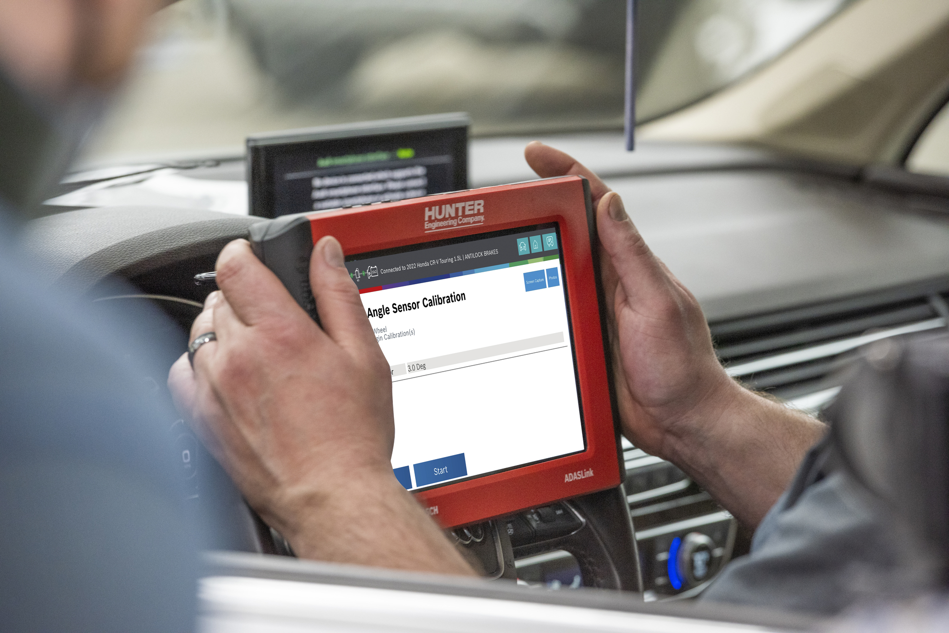 Automotive diagnostic scan tool with dynamic calibration capabilities and integration with Hunter aligners, Ultimate ADAS® and DAS 3000.