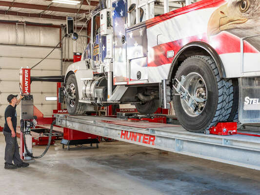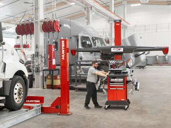 Hunter's Heavy-Duty Four-Post semi and truck lift features galvanized runways, turn plate pockets, and slip plates for servicing heavy or standard vehicles. Optional FIA functions connect it to the aligner to streamline the process.