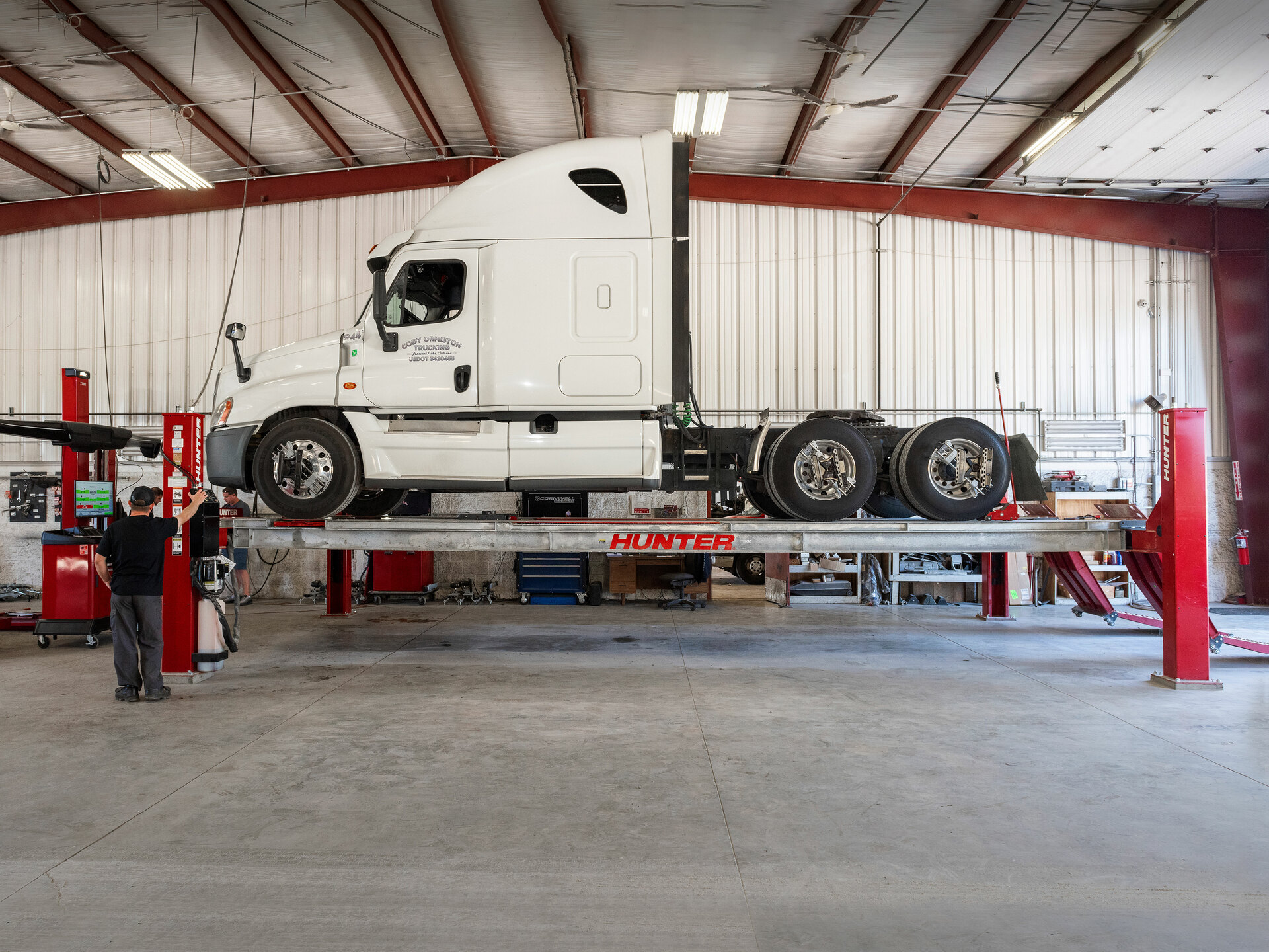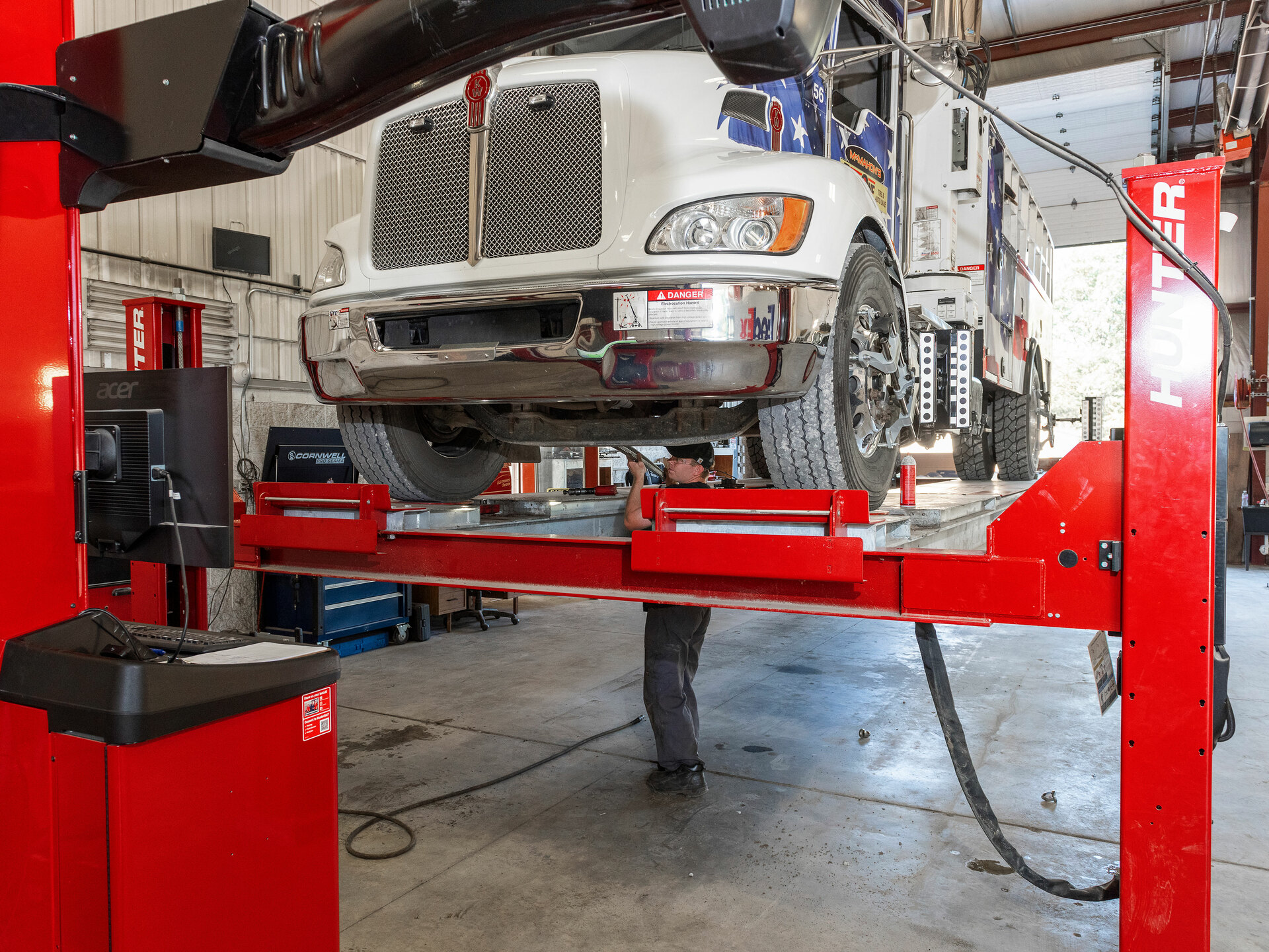 Hunter’s Heavy-Duty Four-Post semi and truck lift features a 35,000-lb. lifting capacity and 300-in. alignment wheelbase capability. The galvanized runways offer the best in corrosion protection for your investment.