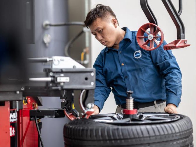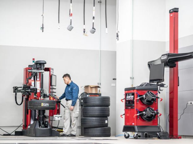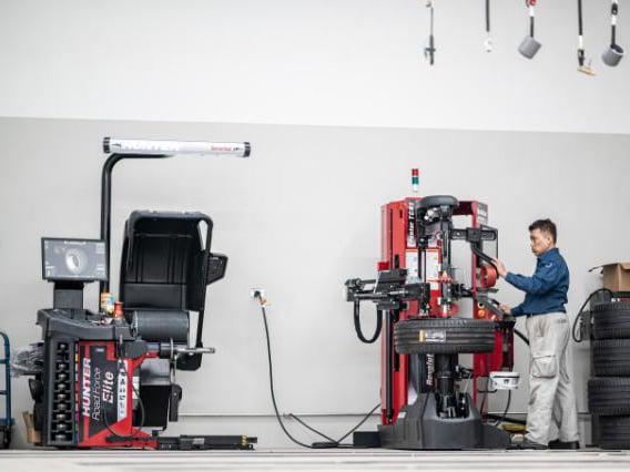 To service vehicle alignments, we have installed the HawkEye Elite® alignment system with over 5,000 vehicle-specific photos and illustrations to assist. Our Road Force® Elite wheel balancer uses the laser vision system to improve balancing accuracy. Our Revolution™ tyre changer with convenient touchscreen interface enforces wheel and technician safety. Each of our Hunter machines provides high-speed and high-accuracy performance. This provides great benefit for our customers and our business.
