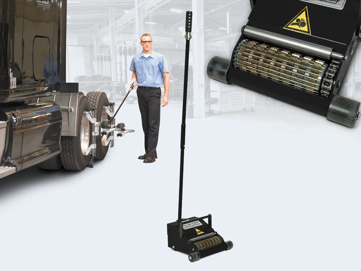 El empujador de camiones de Hunter permite a los técnicos mover sin esfuerzo el camión desde el eje trasero para la compensación rodada.